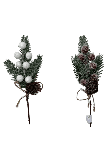 Κλαδάκι χιονισμένο έλατο με κουκουνάρι κ μπαλάκια foam. Υψος 15cm