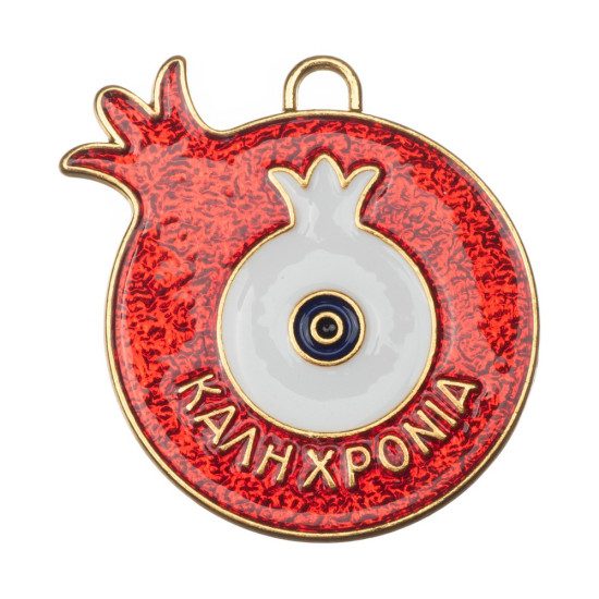 Μεταλλικό Ρόδι με σμάλτο, χρώμα κόκκινο με λευκό “Καλή Χρονιά”. Διαστάσεις: 3,8cm x 4,7 cm